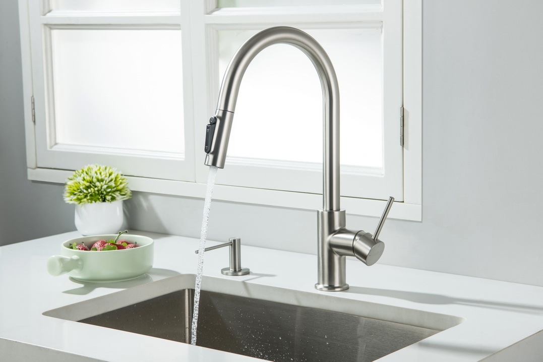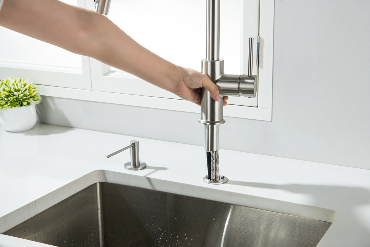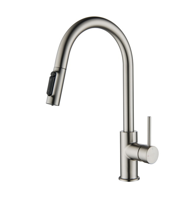 DIANA na wyciąganej wylewce (końcówce) ma 2 przyciski (jeden to przełącznik strumienia wody, drugi do uruchomienia wody filtrowanej.Korpus baterii w całości można podnieść i położyć. Specjalny pierścień pozostaje na blacie (w pozycji użytkowej go nie widać, jest on przykryty korpusem baterii).