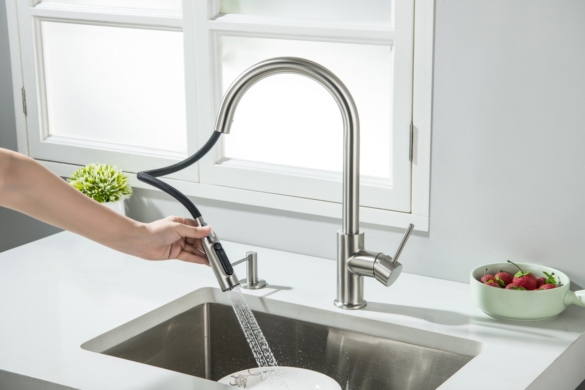 Nie trzeba otwierać (odchylać) rączkę główną. Wystarczy nacisnąć drugi przycisk na wyciąganej wylewce (końcówce) aby uruchomić wodę filtrowaną.