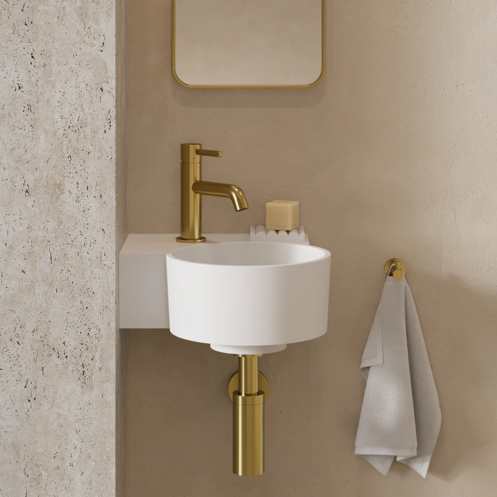 Starannie dopracowana forma umywalki, z perfekcyjnie wykończonymi bokami, zapewnia swobodę montażu i doskonały wygląd w każdej wersji. Zawieszona na ścianie lub w narożniku zachwyca nowoczesną lekkością, a ustawiona na blacie podkreśla wyrazistość i unikalny styl wnętrza. Jej kompaktowe gabaryty czynią ją doskonałym wyborem również do pomieszczeń o ograniczonej powierzchni.