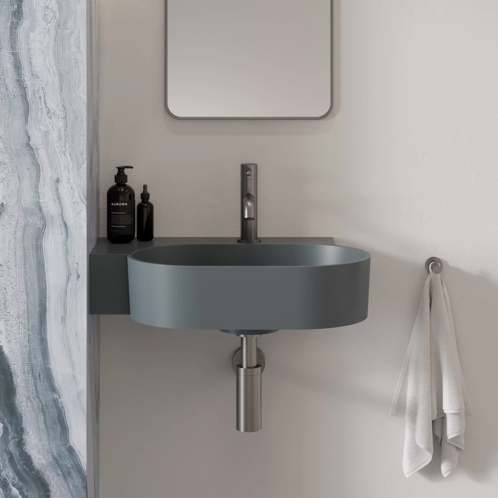 Starannie dopracowana forma umywalki, z perfekcyjnie wykończonymi bokami, zapewnia swobodę montażu i doskonały wygląd w każdej wersji. Zawieszona na ścianie lub w narożniku zachwyca nowoczesną lekkością, a ustawiona na blacie podkreśla wyrazistość i unikalny styl wnętrza. Jej kompaktowe gabaryty czynią ją doskonałym wyborem również do pomieszczeń o ograniczonej powierzchni.