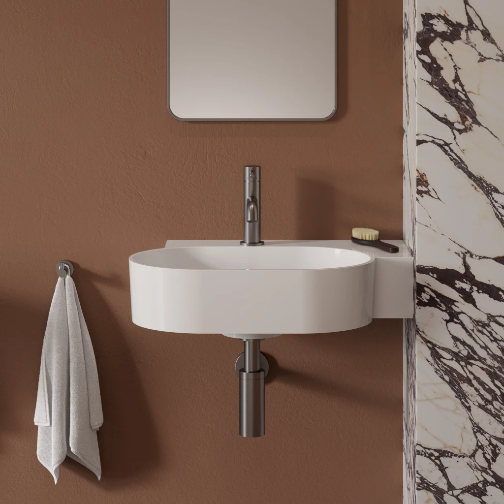 Starannie dopracowana forma umywalki, z perfekcyjnie wykończonymi bokami, zapewnia swobodę montażu i doskonały wygląd w każdej wersji. Zawieszona na ścianie lub w narożniku zachwyca nowoczesną lekkością, a ustawiona na blacie podkreśla wyrazistość i unikalny styl wnętrza. Jej kompaktowe gabaryty czynią ją doskonałym wyborem również do pomieszczeń o ograniczonej powierzchni.