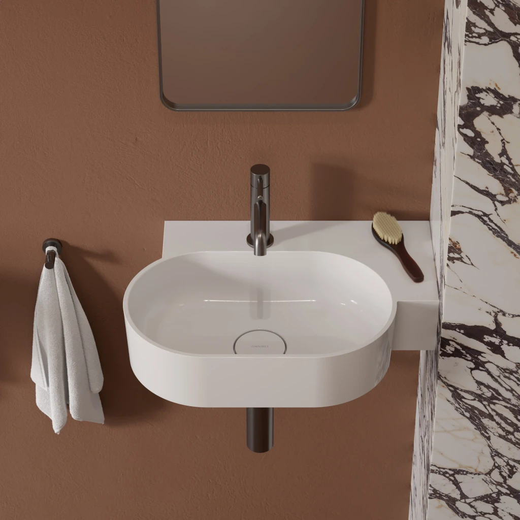 Umywalka z kolekcji OMNIRES OVO charakteryzuje się minimalistyczną, wyrazistą formą o doskonałych proporcjach. Powstały z zabawy geometrią kształt tworzą okrągła misa połączona z prostokątną, funkcjonalną półką - idealnym miejscem do montażu baterii, a także do odstawienia kosmetyków, czy innych niezbędnych akcesoriów. Harmonijnie wyprofilowane ścianki zostały wykończone płaskim, podkreślającym formę rantem, a idealnie dopasowana maskownica odpływu gwarantuje najwyższą estetykę. Od spodu umywalki zaprojektowano dyskretne, fabrycznie podcienione punkty, które wskazują miejsca na wykonanie otworów pod baterię lub dozownik, umożliwiając elastyczne dopasowanie armatury do indywidualnych potrzeb.