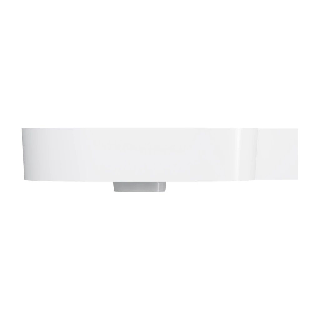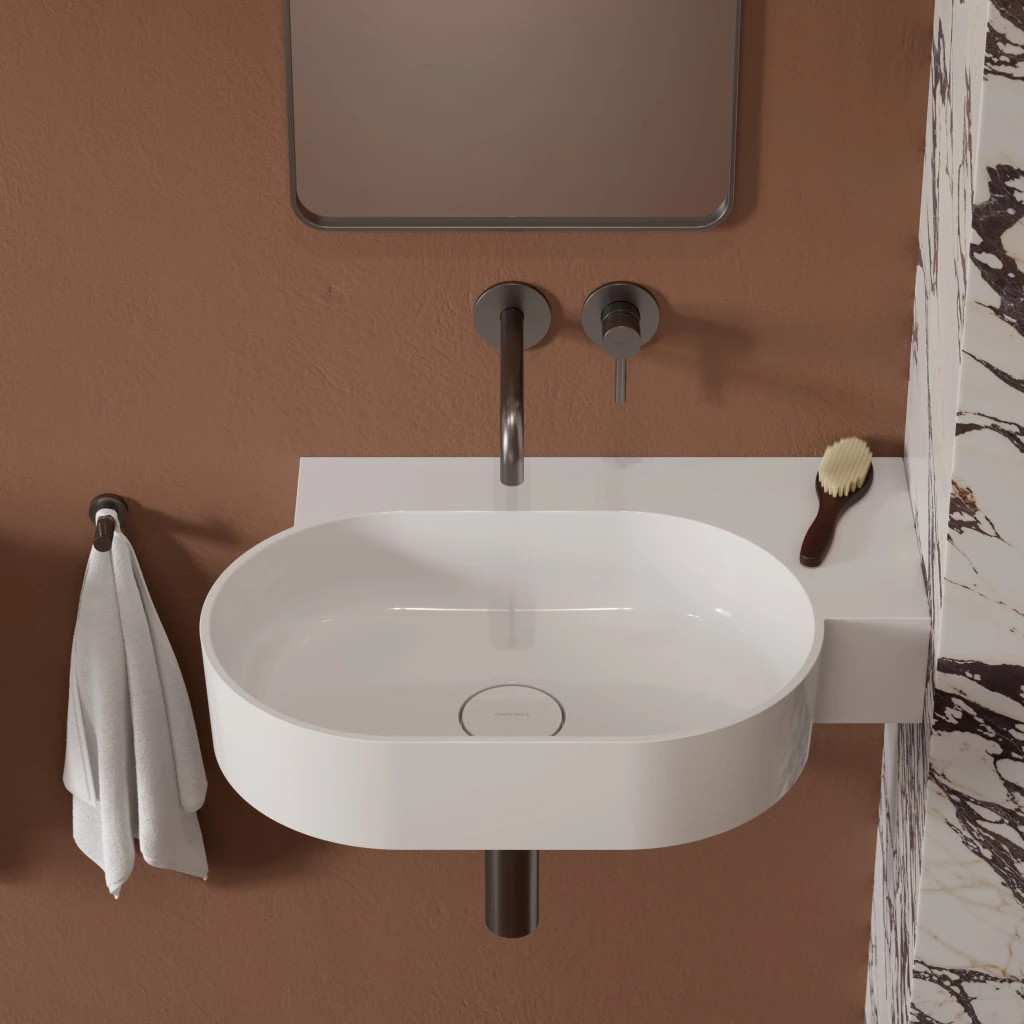 Umywalka z kolekcji OMNIRES OVO charakteryzuje się minimalistyczną, wyrazistą formą o doskonałych proporcjach. Powstały z zabawy geometrią kształt tworzą okrągła misa połączona z prostokątną, funkcjonalną półką - idealnym miejscem do montażu baterii, a także do odstawienia kosmetyków, czy innych niezbędnych akcesoriów. Harmonijnie wyprofilowane ścianki zostały wykończone płaskim, podkreślającym formę rantem, a idealnie dopasowana maskownica odpływu gwarantuje najwyższą estetykę. Od spodu umywalki zaprojektowano dyskretne, fabrycznie podcienione punkty, które wskazują miejsca na wykonanie otworów pod baterię lub dozownik, umożliwiając elastyczne dopasowanie armatury do indywidualnych potrzeb.