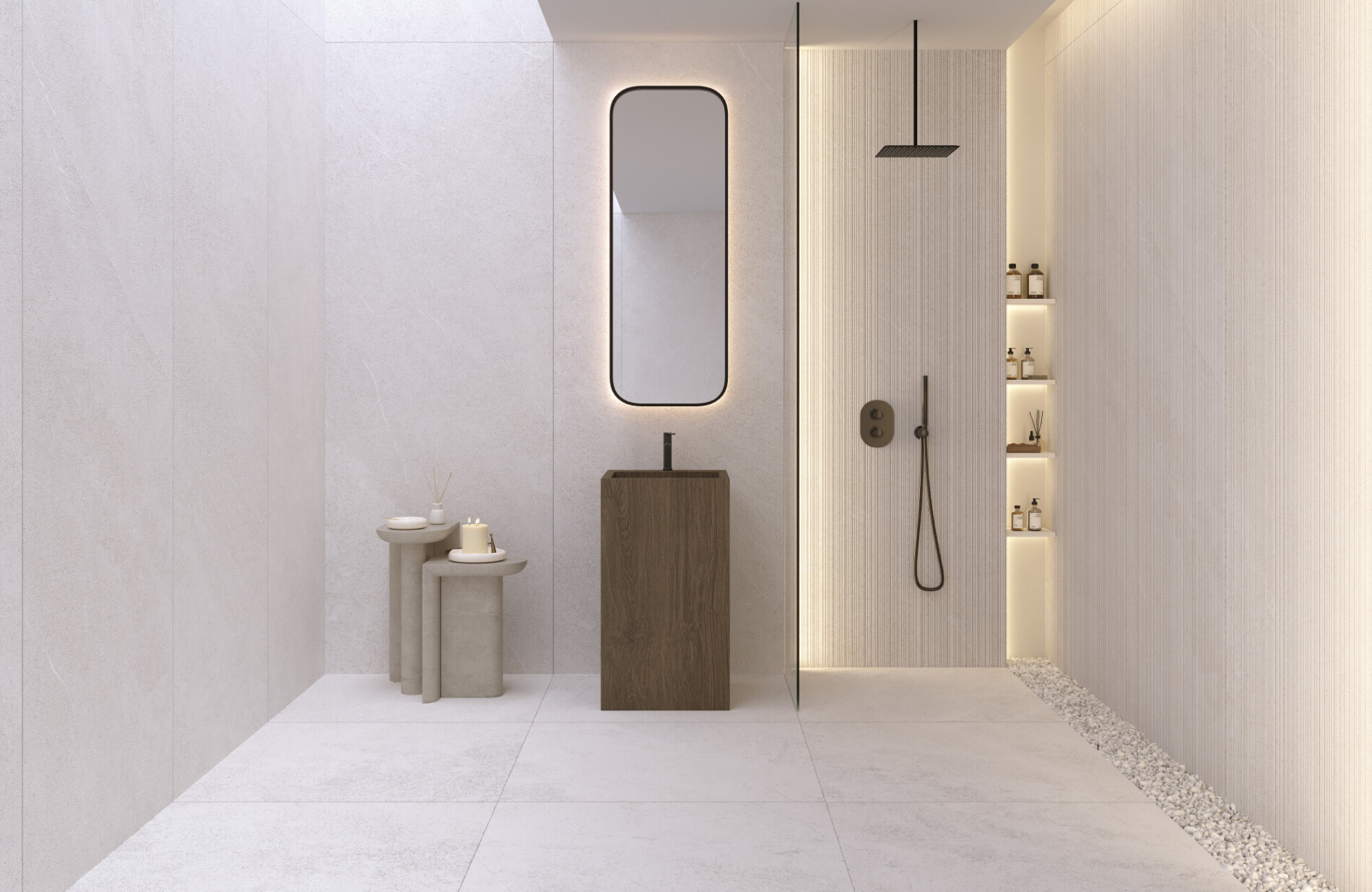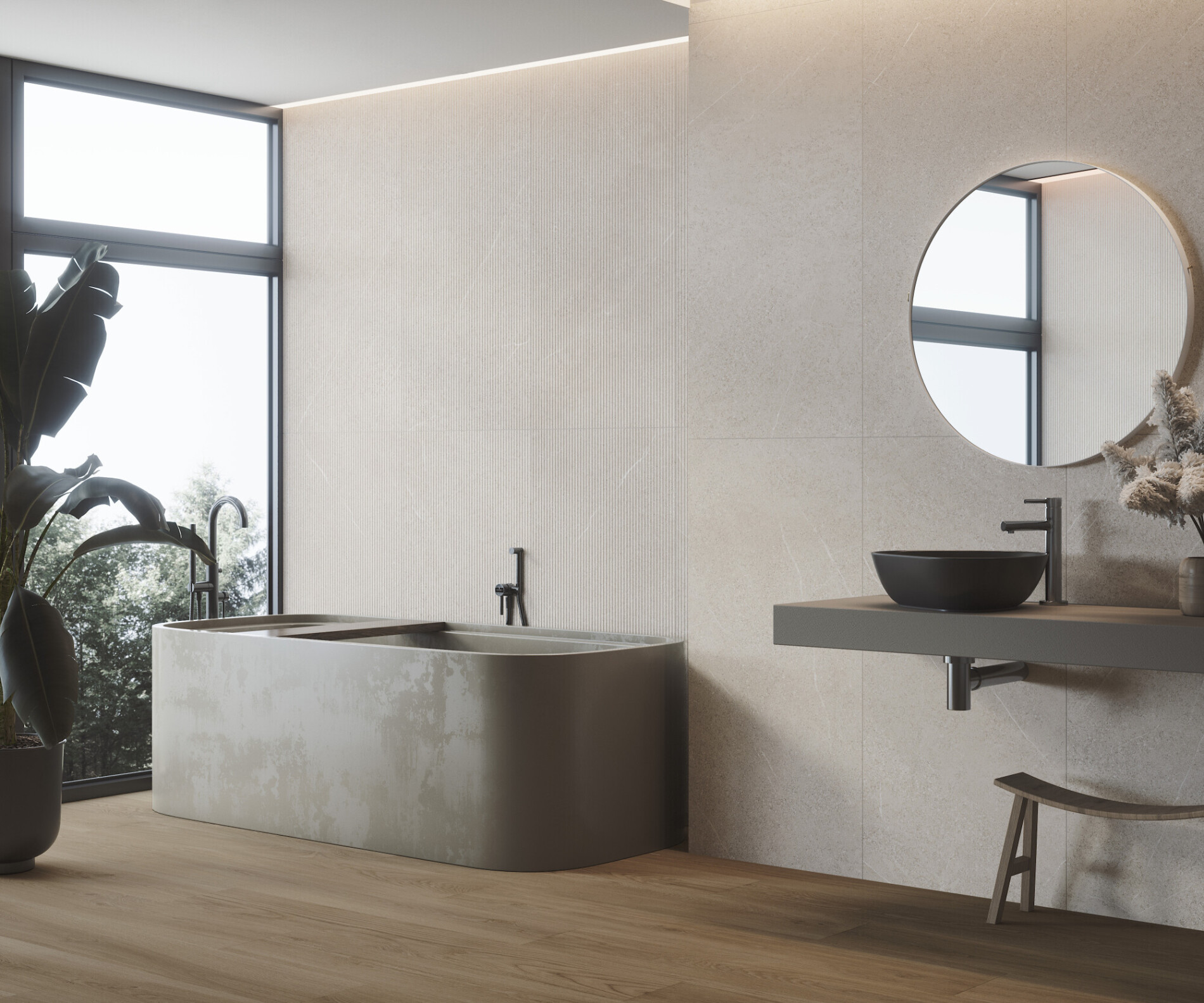 Kolekcja obejmuje również dekoracyjne okładziny z białej masy w formacie 60x120 cm, z wykończeniem Shaped, w jasnych odcieniach Cloud i Sand.