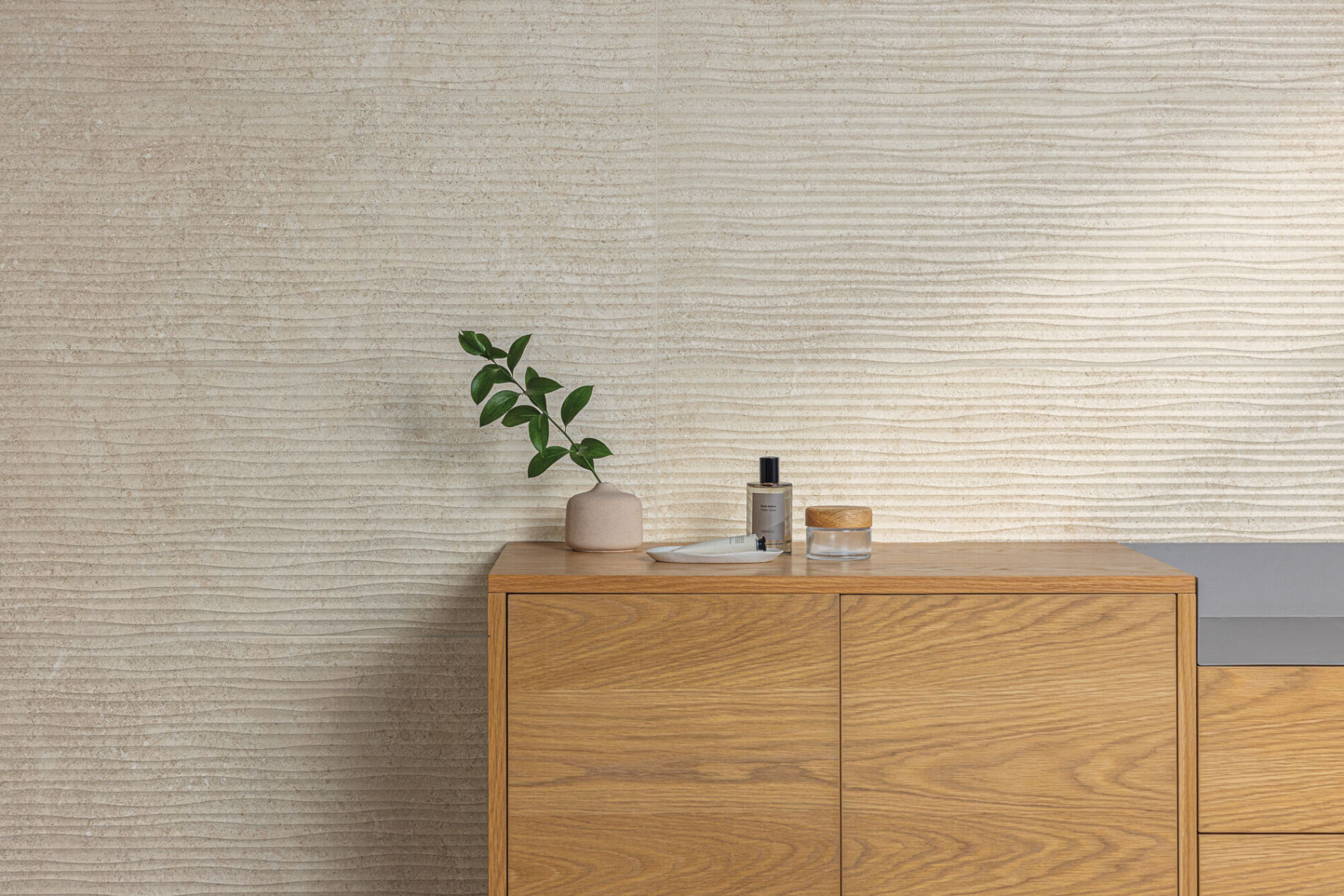 Dostępna w dwóch ciepłych, naturalnych odcieniach, ta propozycja podkreśla ponadczasową elegancję francuskiego kamienia, łącząc partie skamieniałe z lżejszymi fragmentami. Uzupełniają ją dwa dekoracje, które nadają dynamiki i faktury – idealne do tworzenia wciągających kompozycji, możliwych do połączenia z wieloma stylami: od śródziemnomorskiego po najbardziej współczesny nordycki.